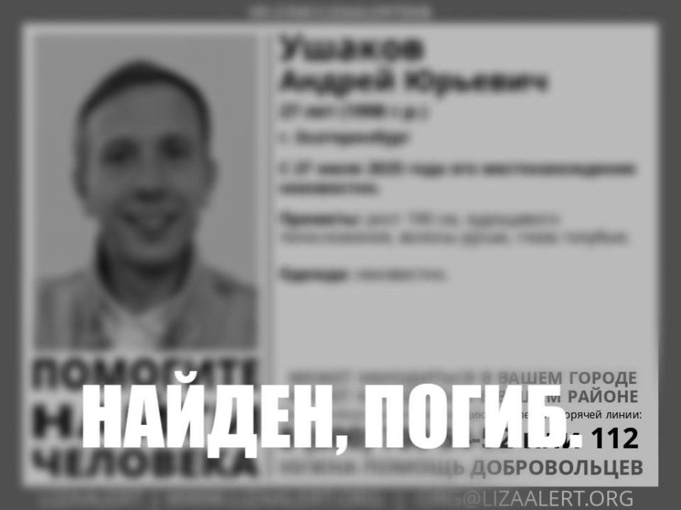 27-летний Андрей Ушаков, которого разыскивали в Екатеринбурге, погиб. Об этом сообщил поисково-спасательный отряд «Лиза Алерт» в своей группе в соцсети «ВКонтакте».