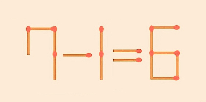 Решили? Проверяем. От нас требовалось из цифры 11 взять одну палочку и переставить ее так, что теперь в начале стоит цифра 7. Теперь равенство является верным: «7-1=6».