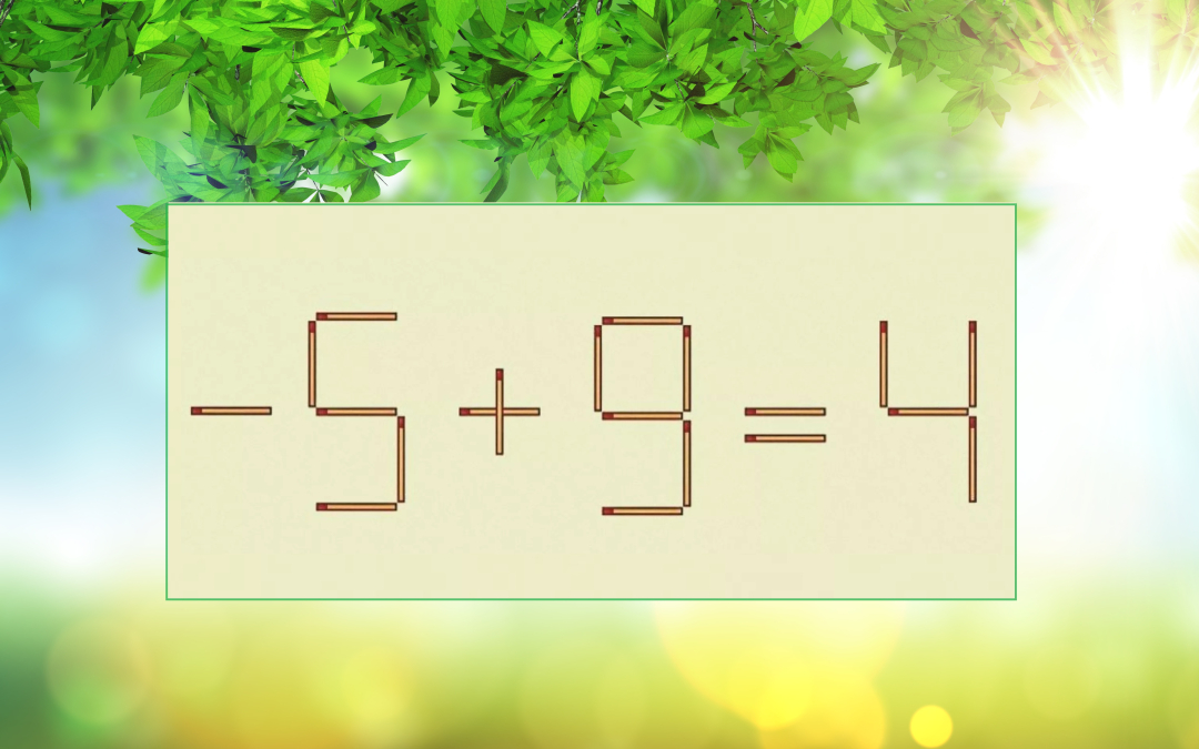 Сверим ход наших действий. Забираем спичку из цифры 6 так, чтобы она стала цифрой 5. Освободившуюся спичку устанавливаем перед цифрой пять знаком минус. Теперь наш пример избавился от ошибки: «-5+9=4».