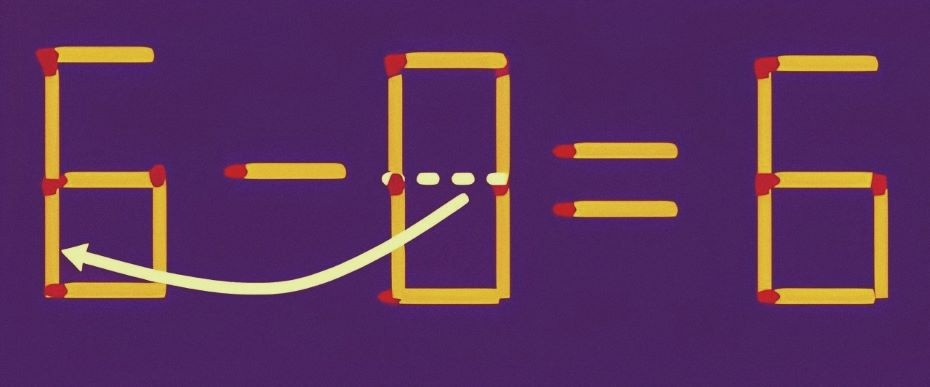 Получилось? Проверим. Нам надо из цифры 8 убрать одну спичку так, чтобы получилась цифра 0. Эту спичку отправляем к цифре 5, которая трансформируется в 6. Теперь мы получили правильное выражение: «6-0=6».