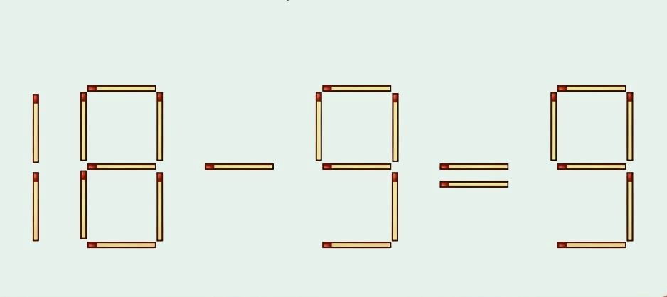 Что же от нас требовалось? Все просто. От знака плюс убираем спичку, чтобы получился знак минус. Далее эту спичку добавляем к цифре 5 так, чтобы она стала цифрой 9. Вот теперь у нас верное равенство: «18-9=9».