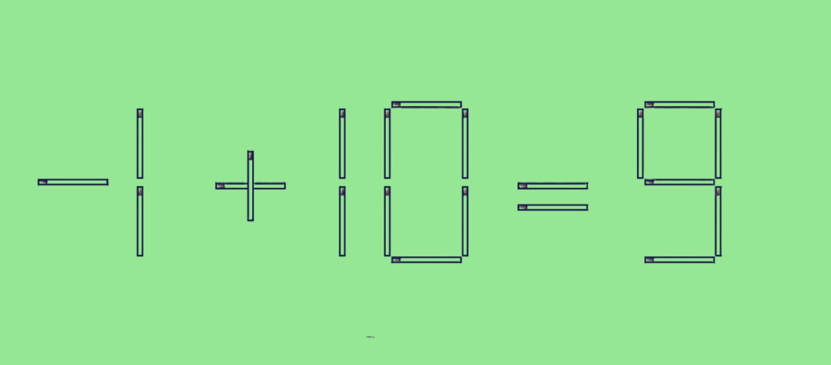 Сверяем ответы. Нам надо взять спичку из цифры 8 так, чтобы она стала цифрой 8. Далее эту спичку устанавливаем перед цифрой 1 знаком минус. У нас получилась равенство «-1+10=9». И это правильная запись.