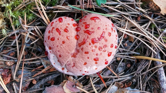 Также екатеринбуржцы нашли в лесу розовые и голубые грибы. Это гиднеллумы, употреблять в пищу их нельзя.