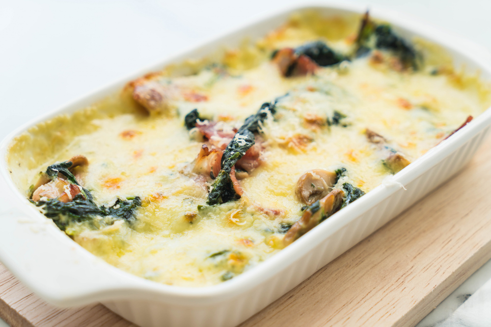 Чтобы проверить готовность, проткните запеканку зубочисткой или ножом. Если она не пускает сок и сверху появилась лёгкая золотистая корочка — блюдо готово.