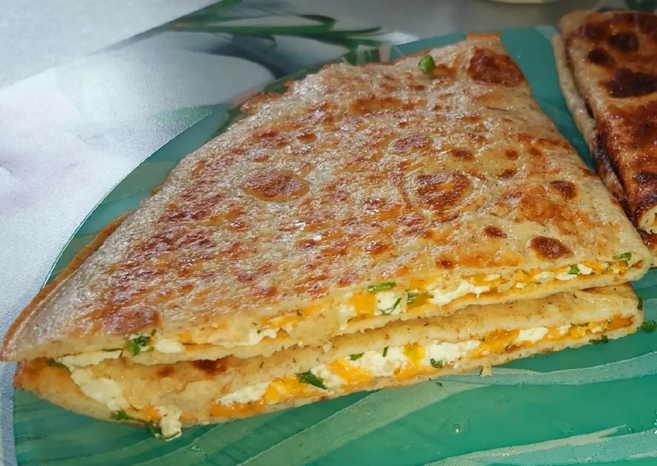 Далее на блин выкладываем начинку — половину начинки, складываем блин пополам и держим на сковородке ещё несколько секунд, пока не расплавится сыр. Также проделываем и с остальной частью смеси и начинки.
