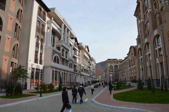 Обедаем в шикарном ресторане отеля «Горки Панорама» на середине спуска в нижнюю часть комплекса. Прогуливаемся напоследок по удивительным улочкам и – вновь в дорогу. Вскоре въезжаем в еще одно необыкновенное творение зодчих под названием Роза Хутор. Городок разделен надвое горной рекой, что придает особую прелесть окружающей действительности.