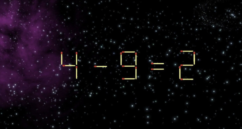 Давайте начнём прямо сейчас. На картинке странный пример: «4-9=2». Но такого же быть не может, верно? Поэтому вам надо этот пример исправить. Переставьте одну спичку так, чтобы он стал верным с точки зрения математики.