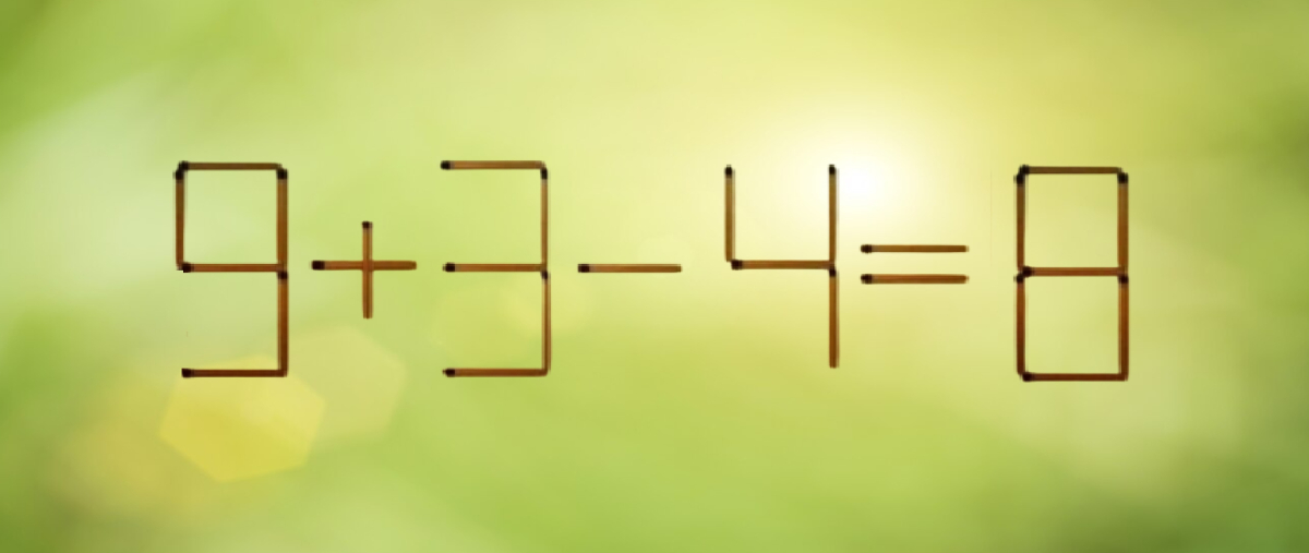 На картинке написано «8 + 3 — 4 = 0». Тут что-то не так, равенство неверное. Нужно переставить всего одну спичку так, чтобы исправить ошибку. Найдите, какая спичка не на своем месте и все портит.