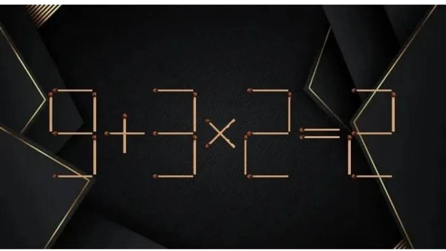 Перед нами спичечное равенство «9+3×2=2». Пример решен с ошибкой. Для исправления потребуется переместить одну спичку. Приступаем к решению.