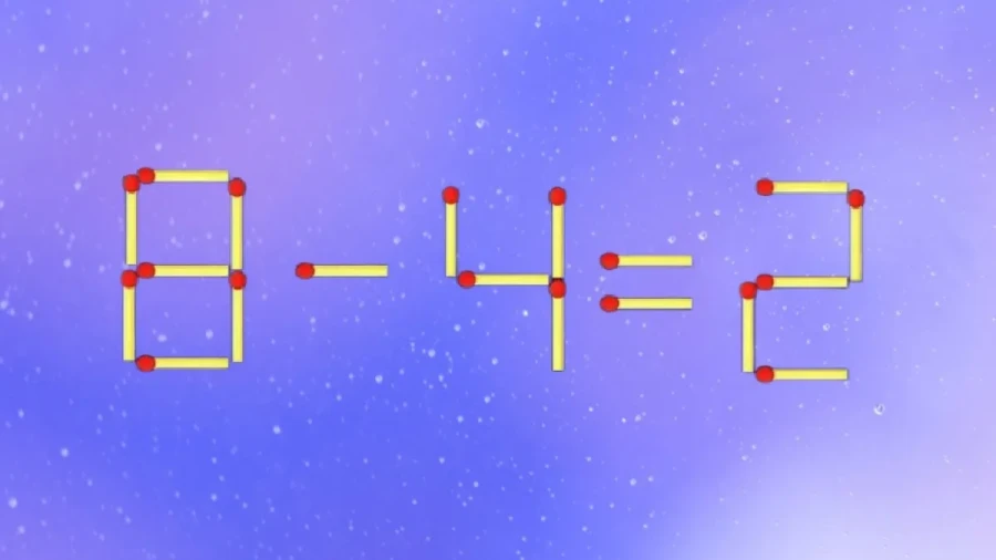 На картинке вы видите пример «8-4=2». Здесь есть ошибка. Вам нужно взять всего одну спичку и куда-то переставить её так, чтобы этот пример стал правильным.
