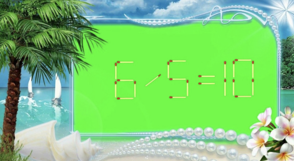 Головоломку смотрите на рисунке. Выражение из спичек 6/5=10 составлено, очевидно, неверно. Вам надо переставить 2 спички в выражении так, чтобы оно оказалось правильным.