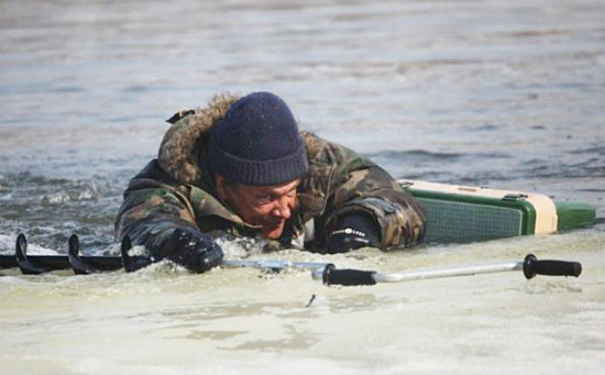 4. Если лед выдержал, перекатываясь, медленно ползите к берегу.