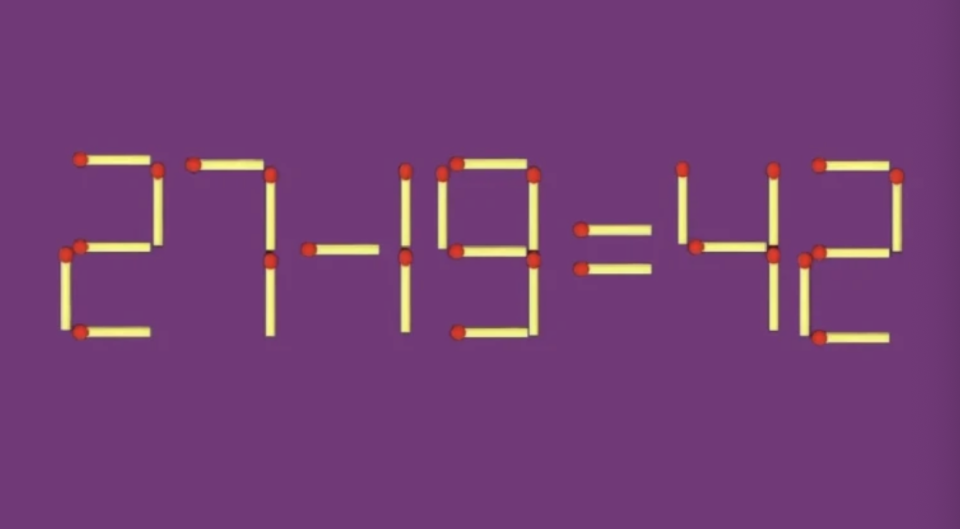 Взгляните на картинку, на ней изображено равенство «27-19=42». Вам необходимо помочь этому примеру стать математически правильным, а для этого следует переставить одну спичку.
