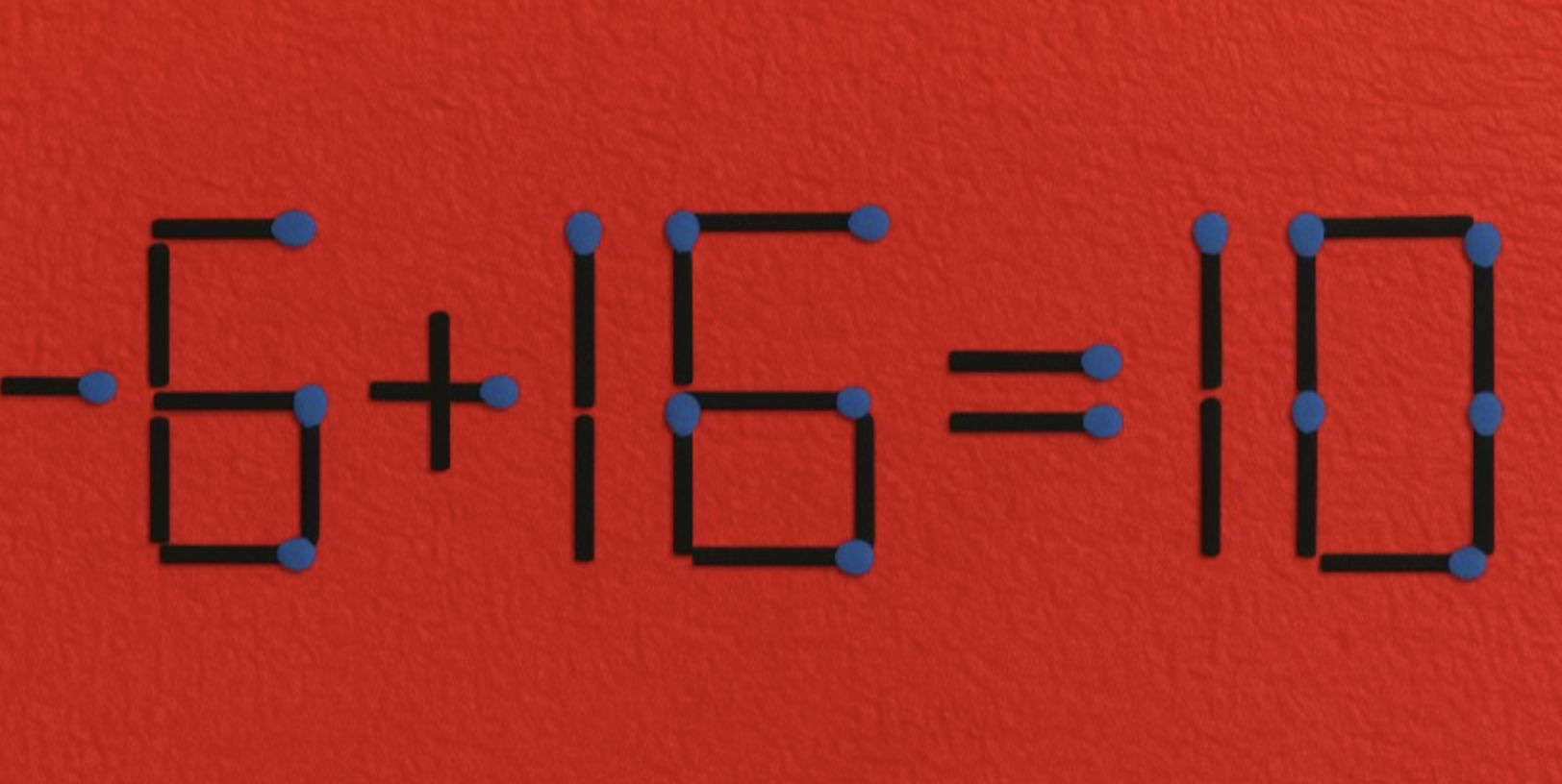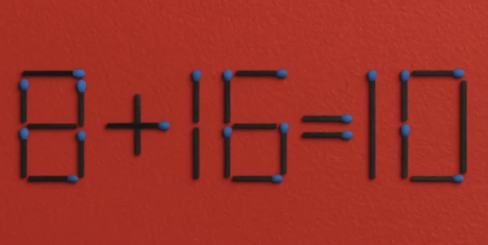 В равенстве «8+16=10» одна спичка лежит не на своём месте, поэтому оно неправильное. Найдите эту неправильную спичку и переставьте её на верную позицию, чтобы пример сошёлся.