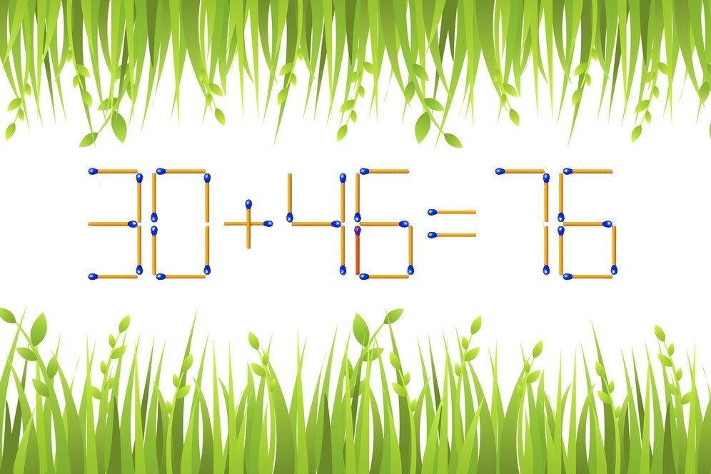 Сверим ход действий. Нам необходимо взять спичку из цифры 8 так, чтобы она стала цифрой 6. Далее эту спичку отправляем в конструкцию цифры 5, чтобы она трансформировалась в 6. Теперь наша запись не имеет ошибок: «30+46=76».