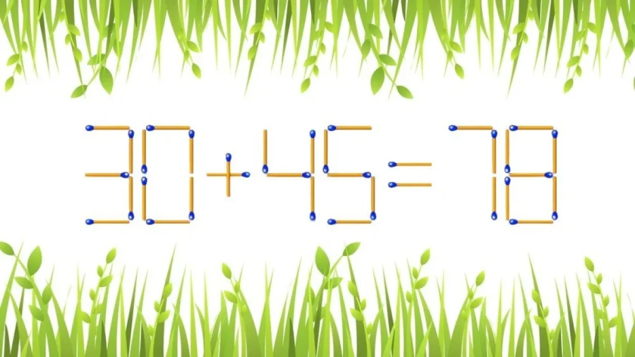 Перед нами равенство «30+45=78». Равенством по существу она считаться не может, пока мы не исправим ошибку. Для этого необходимо переместить одну спичку. Приступайте к решению.