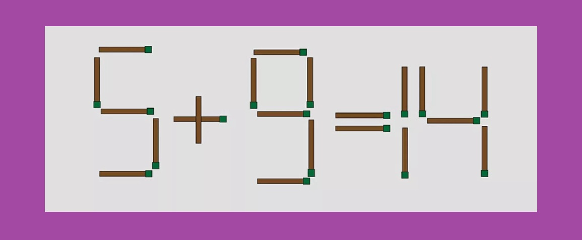Сверим ход действий. Нам необходимо изъять спичку с конструкции цифры 6 так, чтобы она перевоплотилась в цифру 5. Далее эту спичку отправляем в цифру 3, чтобы появилась цифра 9. Теперь наша запись без ошибок: «5+9=14».