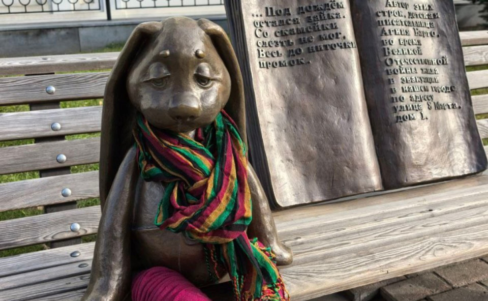 Трогательная забота: екатеринбуржцы снова утеплили бронзового зайку у гимназии №9