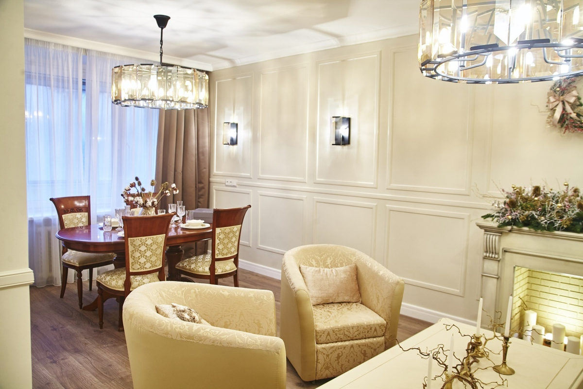 Гостиная выполнена в бежевых оттенках. Стены украшены молдингами, на полу значится паркет. Все говорит о классике. Здесь расположен мягкий диван и кресла в пастельных тонах.