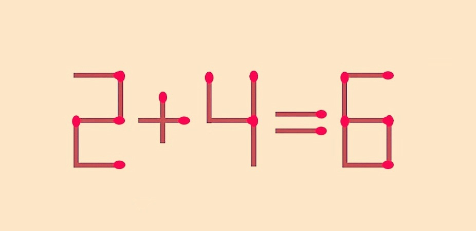 Все очень просто. Надо из цифры 8 изъять спичку так, чтобы получилась цифра 6. Далее лишнюю спичку перемещаем к знаку минус, чтобы он перевоплотился в знак плюс. Теперь наш пример имеет правильный вид: «2+4=6».