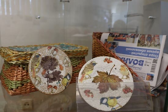 Среди поделок сразу приковывали к себе внимание изящные фигурки девушек. Гибкие, как лоза. Были там плетеные шкатулки, пасхальное блюдо с миниатюрными «гнездышками» под яйца. Зверьё лесное и сказочное. Особенно была хороша сова! Декоративные тарелочки, нежно украшенные в технике декупажа и рельефной яичной скорлупой. Были вазы, а в них – задорность подсолнухов, нежность орхидей, хрупкость тюльпанов. Людмила Петровна очень любила свой сад и воплотила цветы в поделочном формиране.