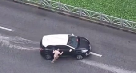 Водитель продолжил движение, волоча за собой психа. Во время такой поездки он лишился и штанов. В какой-то момент мужик от легковушки отцепился, оставшись лежать на дороге.