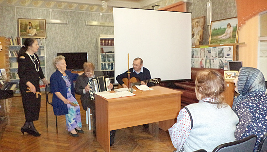 Встреча началась с необычного музыкального вступления – О.Симаков на баяне, а Г. Янин на гитаре вместе исполнили небольшую музыкальную миниатюру, популярную в 80-е годы прошлого века. Ведущий библиотекарь Л.Г.Астапова, неизменный организатор и вдохновитель творческих мероприятий, проходящих в библиотеке, представила авторов книги и предоставила им слово. Как символ света, сияющего в этом мире, О.Симаков зажег свечу и начал рассказ о своем творческом пути.
