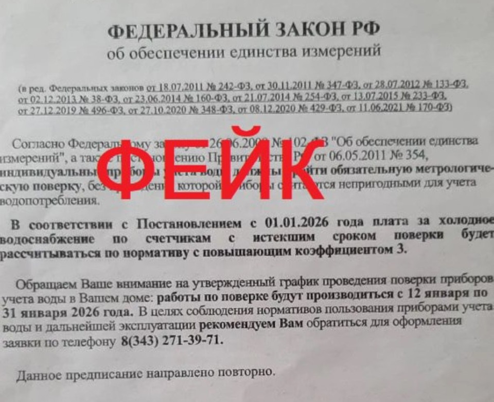 В Екатеринбурге мошенники рассылают фейковые предписания о поверке счетчиков