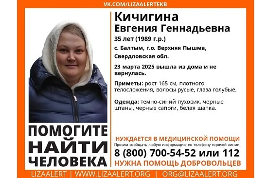 Приметы женщины, которая вышла из дома в селе Балтым 23 марта и до сих пор не вернулась: рост 165 см, плотное телосложение, голубые глаза, русые волосы. На момент пропажи была одета в чёрные штаны, тёмно-синий пуховик, белую шапку, чёрные сапоги.