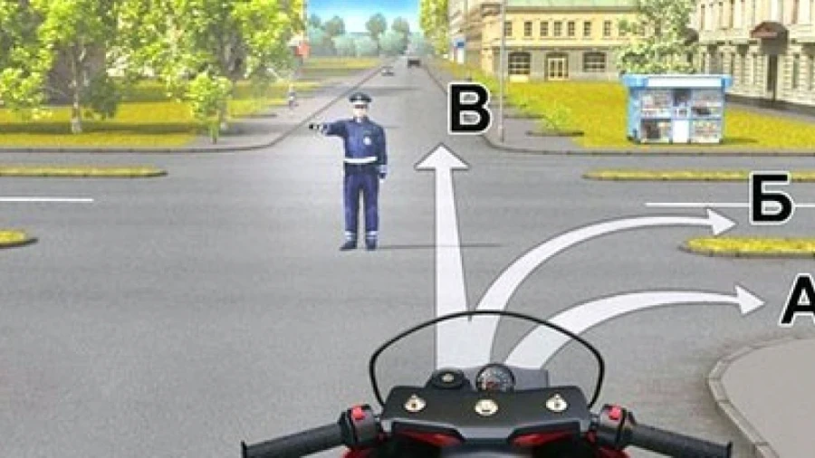 Многие считают, что в этом случае у водителя есть несколько вариантов. Однако это не так. Когда регулировщик находится в таком положении, то разрешается движение исключительно направо. В нашем случае правильным ответом будет вариант А. При выборе «Б» или «В» вы совершите ошибку.