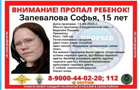 В Верхней Пышме ищут 15-летнюю Софью Запевалову. Она пропала во вторник, 13 мая. Ориентировку на подростка публикует поисковый отряд «Прорыв».