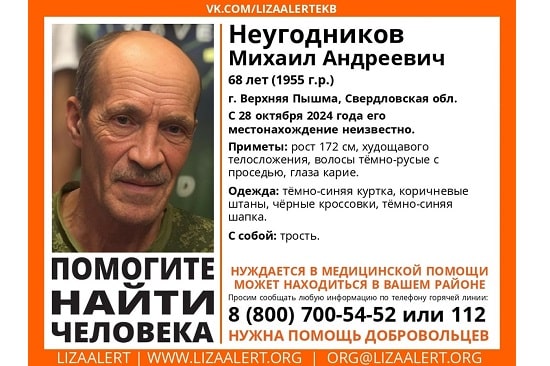 Пропавшего в Верхней Пышме 68-летнего пенсионера с тростью пятый день ищут родные и волонтёры. Михаил Андреевич Неугодников нуждается в медицинской помощи. О его местонахождении неизвестно с понедельника.