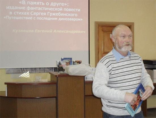 Книгу известного в нашем городе журналиста С. А. Гржебинского «Путешествие с последним динозавром» представил его друг Евгений Александрович Кузнецов, благодаря которому она и была издана. И дело тут не только в финансировании, но и в подготовке материала к изданию. Ведь автор, Сергей Александрович Гржебинский, ушел из жизни, так и не закончив своего многолетнего труда.