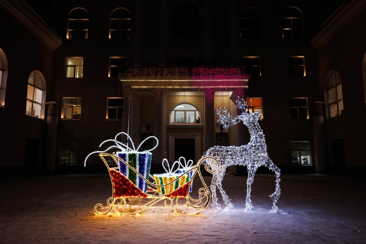 А у Дворца культуры «Металлург» поселилась целая сказочная сцена: олень везёт сани, в которых восседает Дед Мороз.