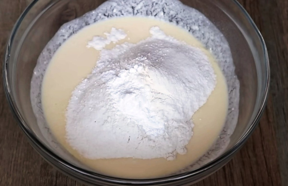 Тесто готовится буквально за несколько минут. В миске вилкой или венчиком смешивают яйца и сметану до однородности, добавляют соль и сахар. Затем просеивают муку с разрыхлителем и аккуратно вмешивают в жидкую основу. Тесто по консистенции получится похожим на блинное..