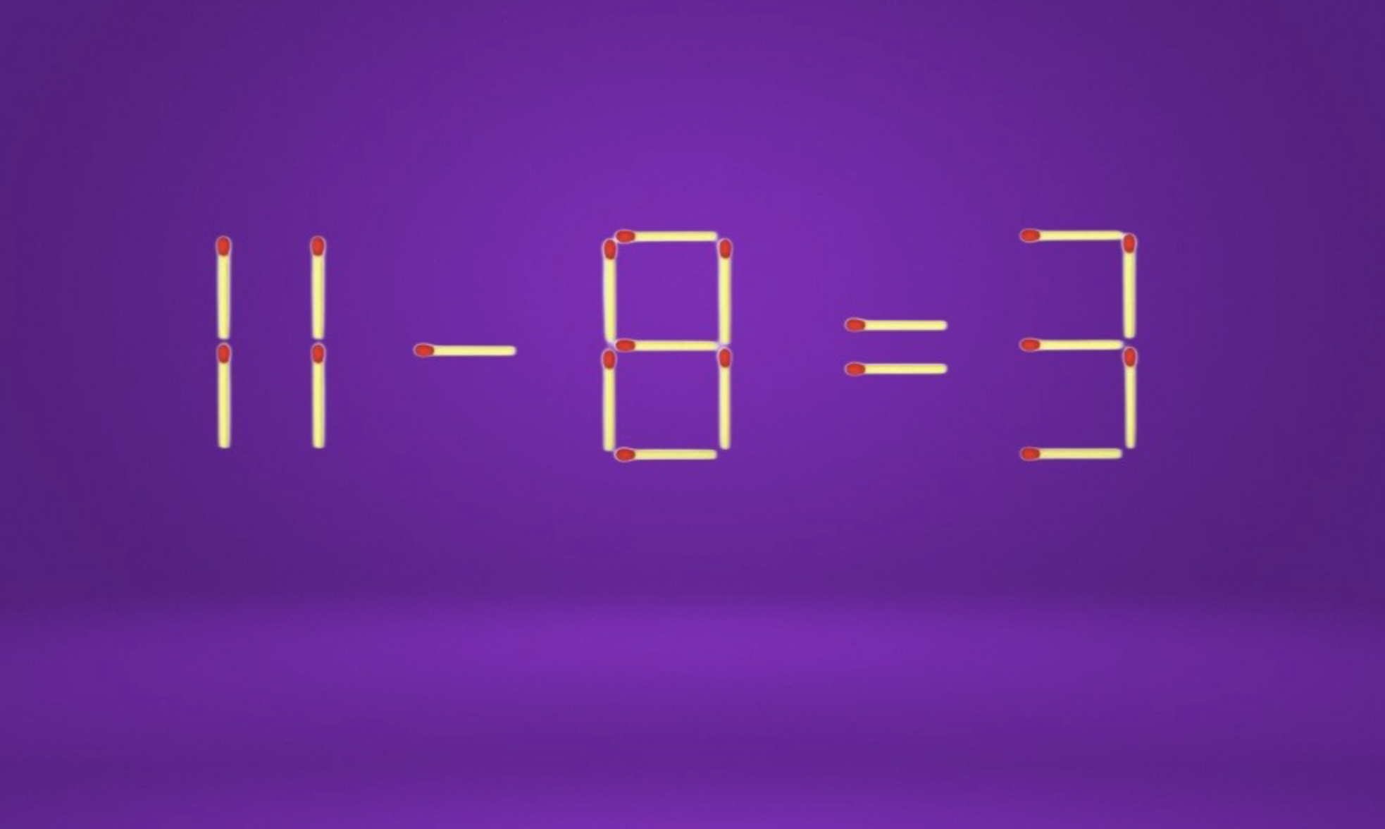 Берём одну деталь из цифры «9», превращая её в «3». Эту лишнюю спичку переносим к нулю, превращая его в «8». В итоге получаем идеальное равенство «11-8=3». Теперь всё верно!