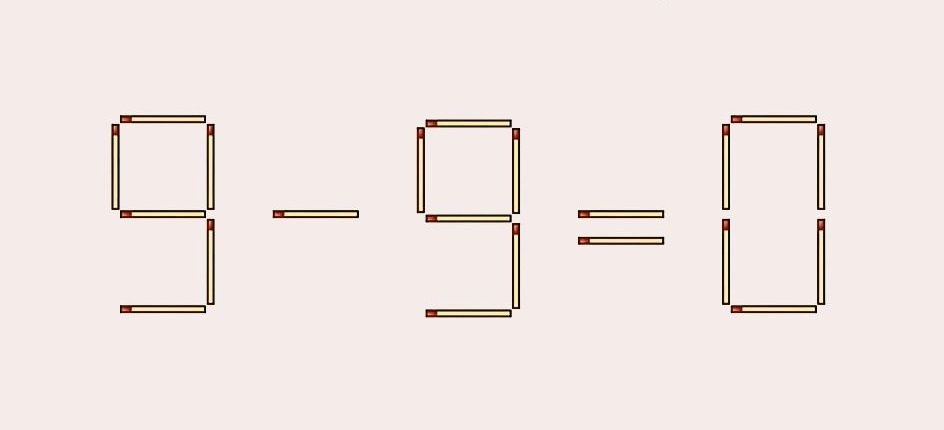Сверим ответы. Нам необходимо из цифры 8 изъять одну спичку так, чтобы получилась цифра 9. Далее эту спичку устанавливаем в цифре 3 так, чтобы она трансформировалась в цифру 9. Теперь у нас получилась запись «9-9=0». Теперь все правильно.