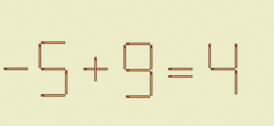 Нам надо изъять спичку из цифры 6 так, чтобы она стала цифрой 5. А затем лишнюю спичку ставим минусом перед цифрой 5. У нас получится верная запись: «-5+9=4».