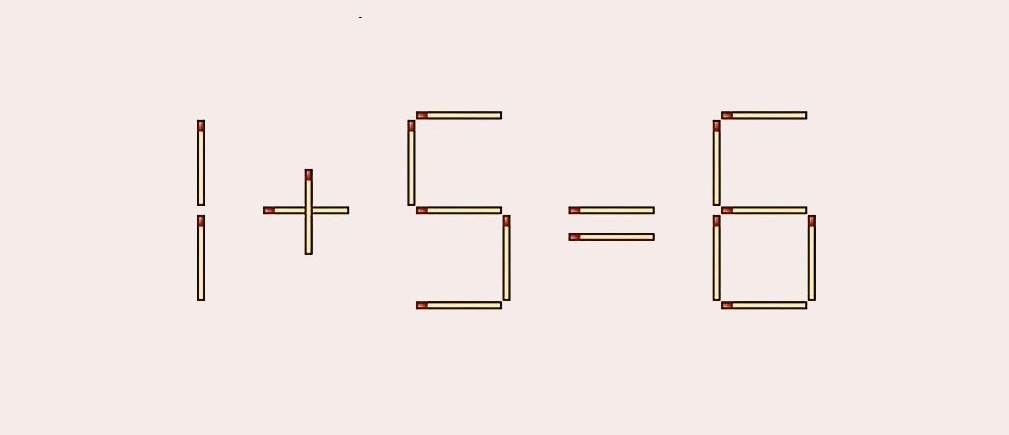 Получилось решить? Все достаточно легко. Нам надо изъять спичу из цифры 8 так, чтобы она стала цифрой 6. Далее эту спичку передвигаем к знаку минус и делаем знак плюс. Теперь наша запись приобрела правильный вид: «1+5=6».