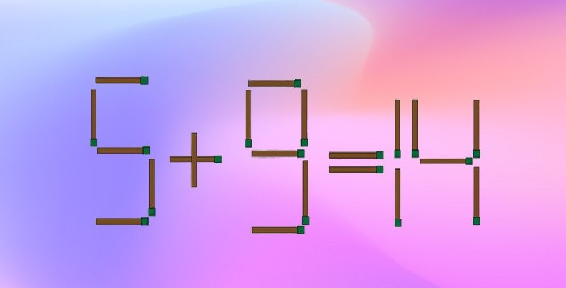 Сверим ход действий. Забираем одну спичку из цифры 6 так, чтобы она стала цифрой 5. Эту спичку добавляем к цифре 3, чтобы она перевоплотилась в цифру 9. Сейчас наша запись без ошибок: «5+9=14».