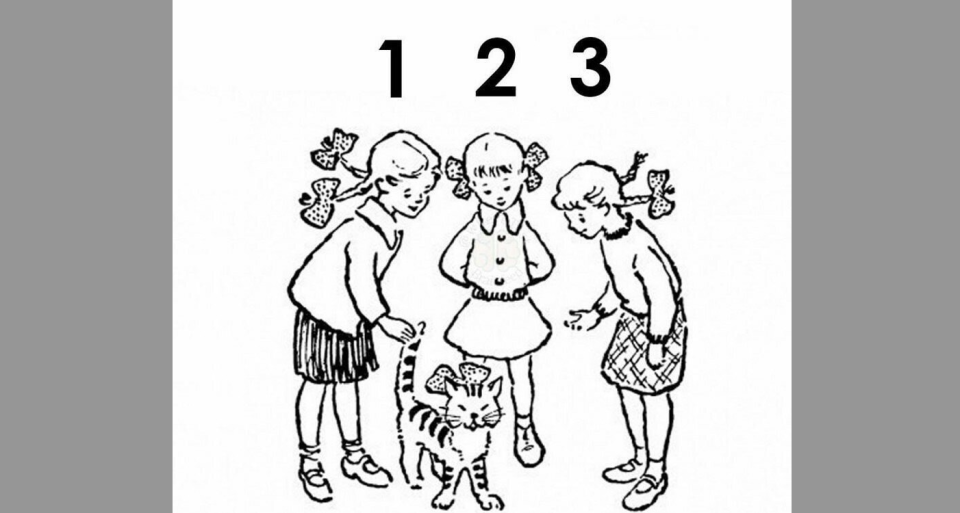Если присмотреться, то можно увидеть, что у третьей девочки бантик только на одной косичке. Второй она отдала своему котику, значит правильный ответ — кот принадлежит девочке под номером три.