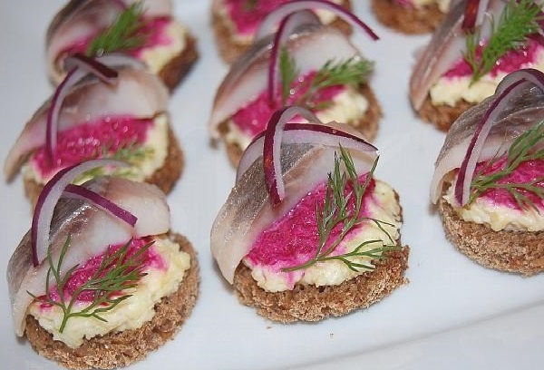 Эти маленькие закусочные бутерброды не с красной икрой, а всего лишь селёдкой, несмотря на простоту ингредиентов и способ приготовления, прекрасно подходят для праздничного стола — так совершенно небезосновательно считает автор портала «Мама Люба». А готовятся они так: