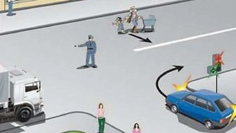 А вот и правильный ответ. По правилам дорожного движения, сигналы регулировщика находятся в приоритете у водителей. То есть, водитель реагирует на указания регулировщика. Легковому автомобилю подается знак, разрешающий поворот. Водитель может свернуть направо, но перед этим обязан пропустить пешеходов.