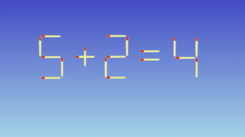 Ну что, давайте попробуем решить одну из таких задачек. На иллюстрации пример «5+2=4», и с ним явно что-то не так. И правда, ведь 5+2 не равно четырём. Это выражение нарочно сделали неверным, ведь ваша задача — переставить одну спичку так, чтобы он стал правильным.