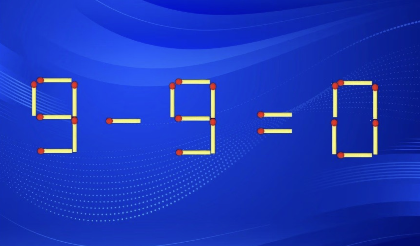 Попробуйте изменить цифру «8». Если переставить одну спичку, восьмёрка превратится в «0». Эту свободную спичку нужно добавить к тройке, чтобы она стала девяткой. В итоге получится правильный пример: «9-9=0».