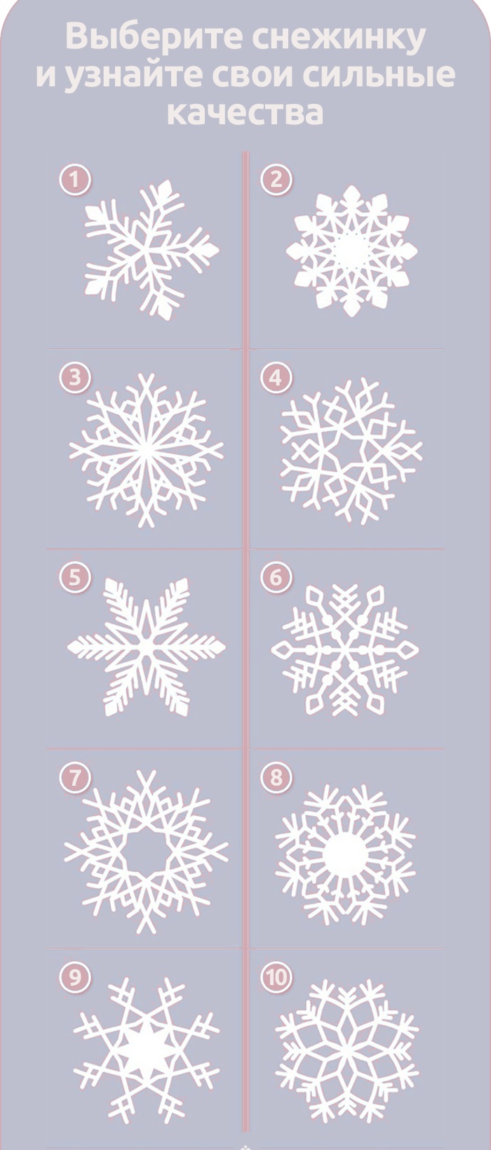 Перед вами иллюстрация из 10 различных снежинок. Какая приглянулась вам больше всех? Ответ раскроет ваши сильные стороны характера.