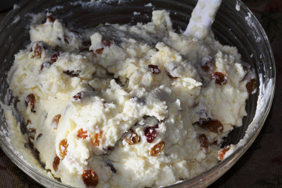 Приступаем к готовке. В миску выкладываем половину пачки творога. К нему же отправляется мука. Добавляем сахар и разбиваем яйцо. Промываем и отжимаем изюм, после чего закидываем в миску. Вместо изюма можно использовать чернослив, курагу, цукаты, орехи. Все тщательно перемешиваем. У нас получилась творожная смесь.